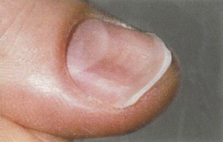●貧血を伴う患者の爪の写真を示す。