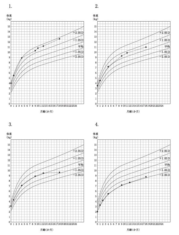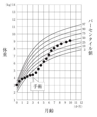 身体所見:身長153.0cm(標準152.4cm)、体重61.7kg(標準44.1kg)。血圧100/60mmHg。心音と呼吸音に異常はない。腹部は平坦、軟で、肝臓と脾臓を触知しない。
