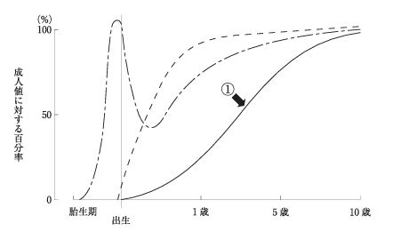 ●生後から20歳になるまでの器官の発育発達を示した曲線(Scammon<スカモン>の発育発達曲線)を図に示す。